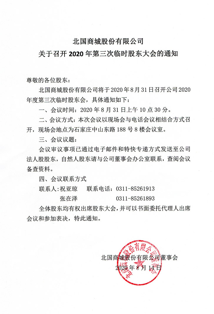 北國(guó)商城股份有限公司關(guān)于召開(kāi)2020年第三次臨時(shí)股東大會(huì)的通知