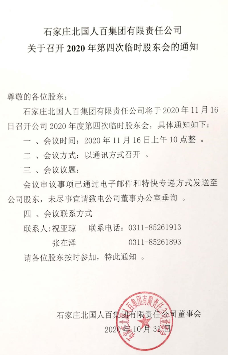 石家莊北國(guó)人百集團(tuán)有限責(zé)任公司關(guān)于召開(kāi)2020年第四次臨時(shí)股東會(huì)的通知