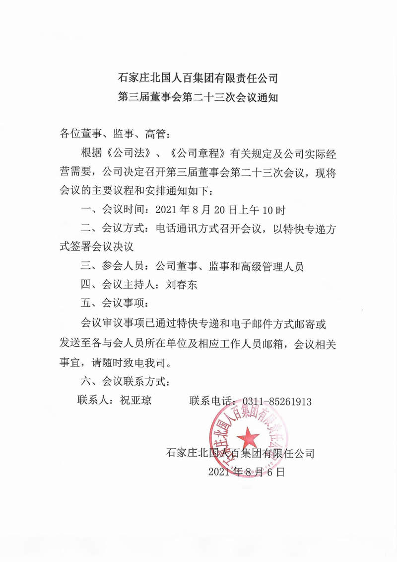 石家莊北國人百集團有限責任公司第三屆董事會第二十三次會議通知