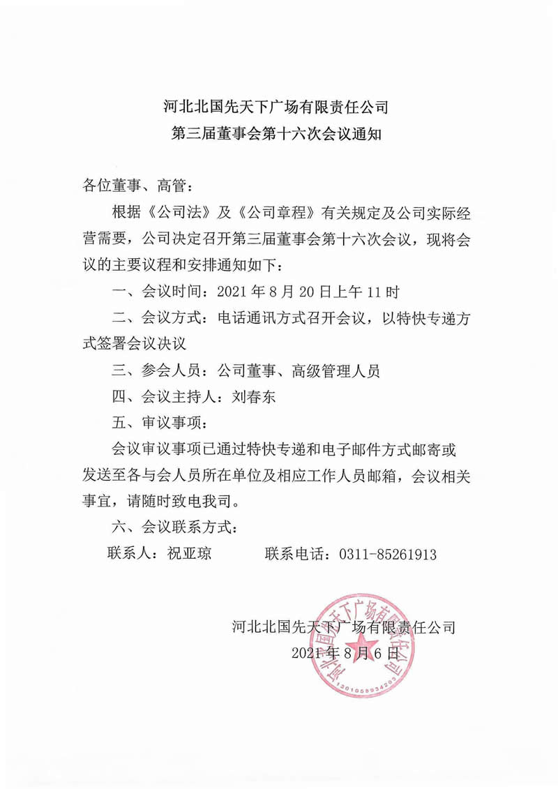 河北北國先天下廣場有限責(zé)任公司第三屆董事會第十六次會議通知