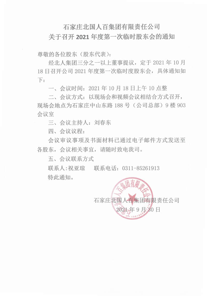 石家莊北國人百集團(tuán)有限責(zé)任公司關(guān)于召開2021年度第一次臨時(shí)股東會(huì)的通知