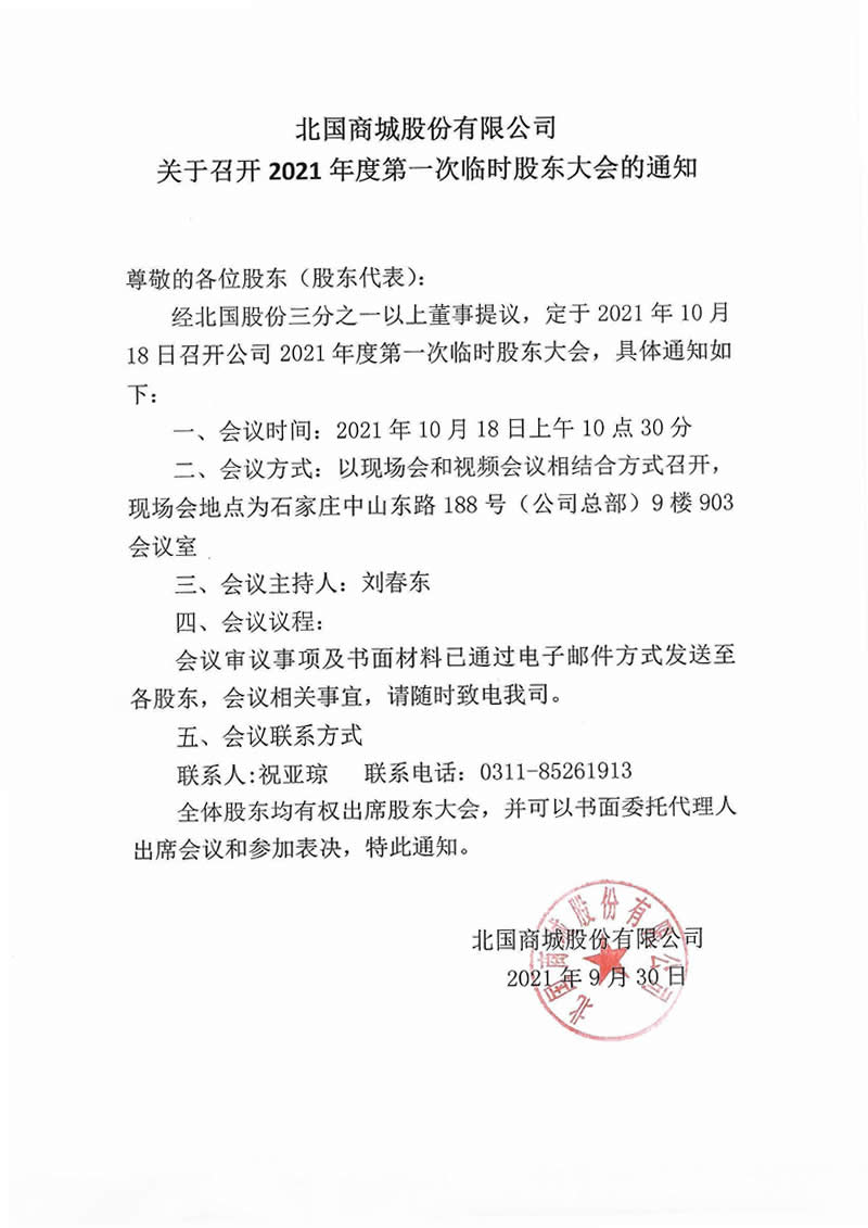 北國(guó)商城股份有限公司關(guān)于召開2021年度第一次臨時(shí)股東大會(huì)的通知