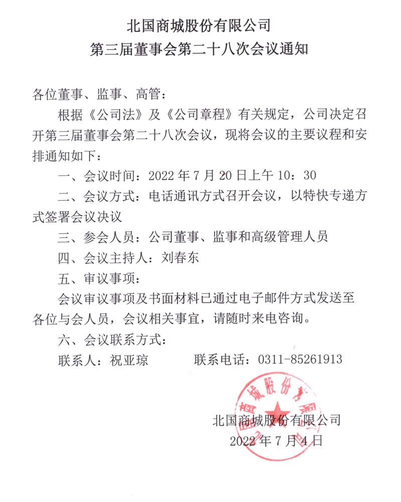 北國商城股份有限公司第三屆董事會(huì)第二十八次會(huì)議通知