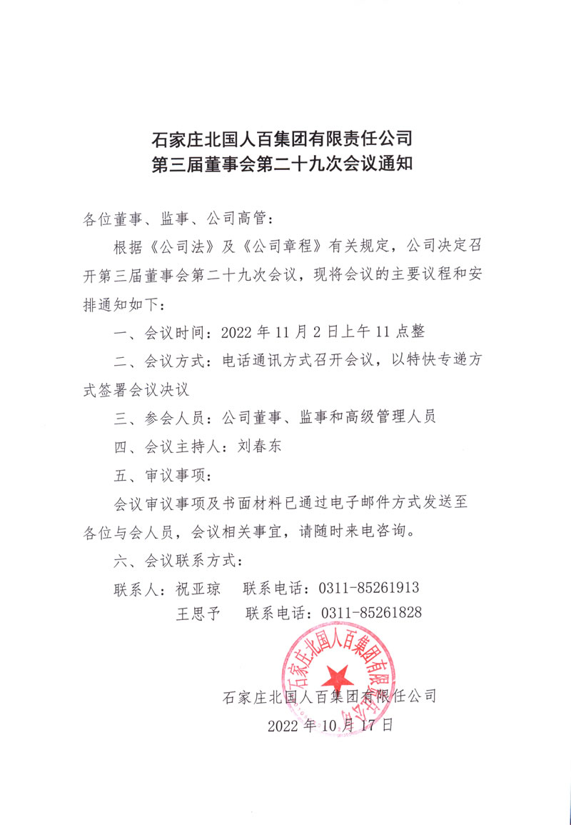 石家莊北國人百集團有限責任公司第三屆董事會第二十九次會議通知