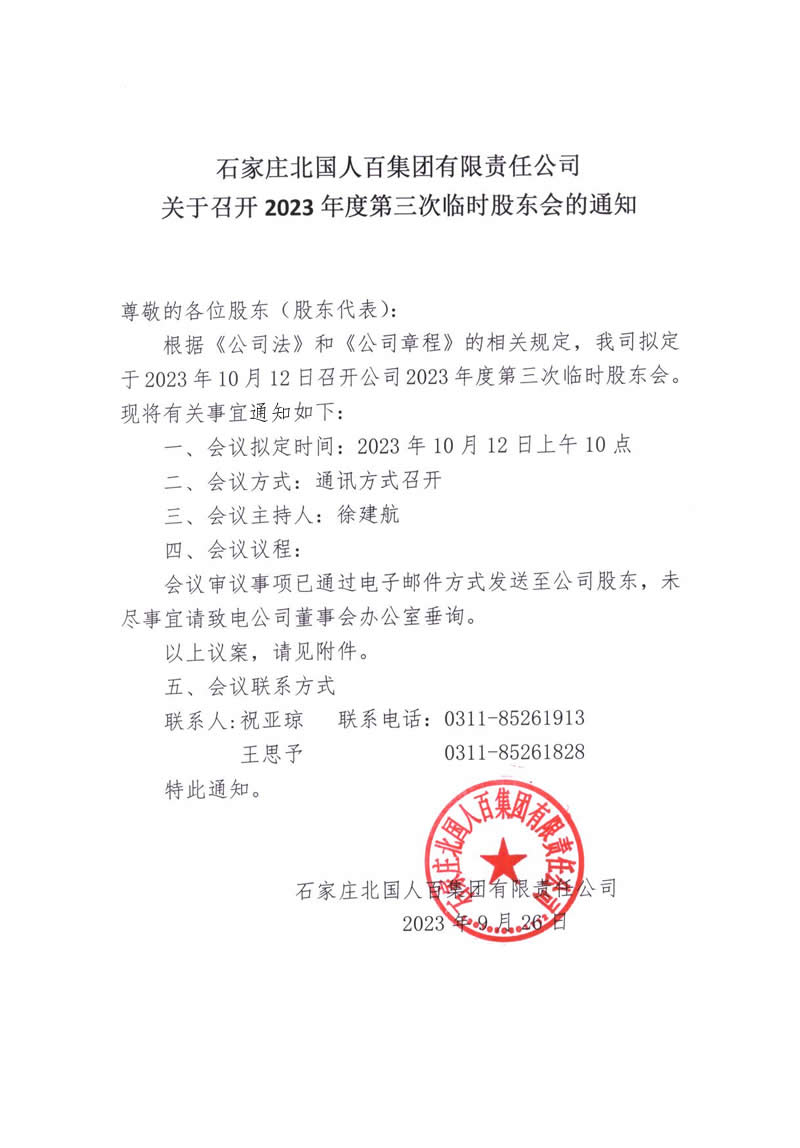 石家莊北國人百集團有限責任公司關于召開2023年度第三次臨時股東會的通知