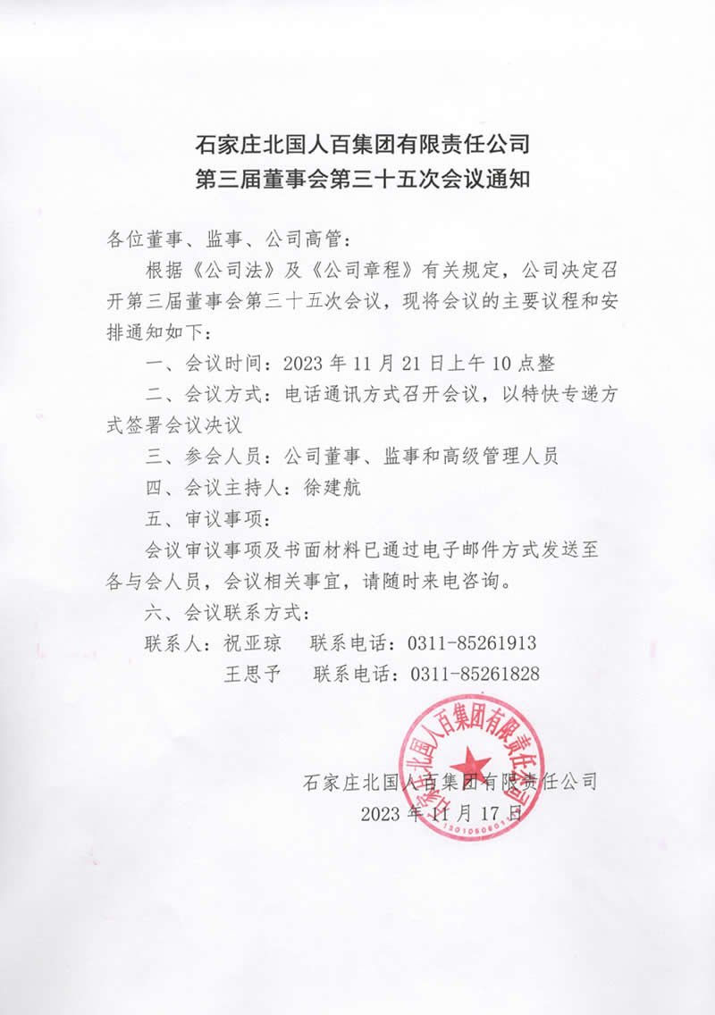 石家莊北國人百集團(tuán)有限責(zé)任公司第三屆董事會第三十五次會議通知