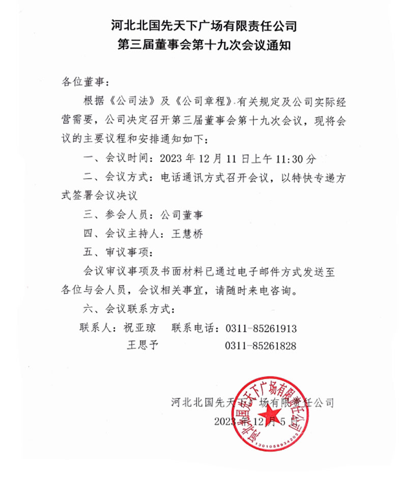 河北北國先天下廣場有限責(zé)任公司第三屆董事會第十九次會議通知