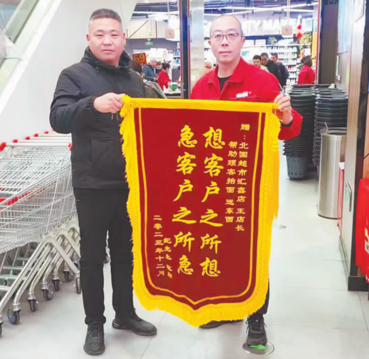 一天上午我正在一樓巡視工作,看見一位老大爺推著一袋面,動作看上去很吃力,我立即上前詢問:“大爺,有什么我能幫您的嗎?”大爺說:“買了一袋面粉,到這兒搬不走了!”“小事,我?guī)湍帷蔽乙粡澭樖志桶衙娣劭傅郊缟稀!按鬆,您的車子在哪啊?我給您送過去!贝鬆斶B連說:“就在前面,太感謝你了,小伙子慢一點!”我把面粉給大爺送到三輪車上后,表示想給大爺送回家,大爺說什么都不讓!斑@就夠麻煩你的了,可不能再耽誤你工作了!蔽艺f:“不麻煩,這也是我的工作!贝鬆斣偃硎靖兄x,就是不讓送,我目送老人家慢慢騎走三輪車后,就回到了工作崗位。幾天后,一位顧客來到服務(wù)臺,員工熱心接待后得知是大爺?shù)募胰。顧客說老人回家后一直說北國員工真好,今天是特意受大爺?shù)奈杏H自到店表示感謝并贈送錦旗的。