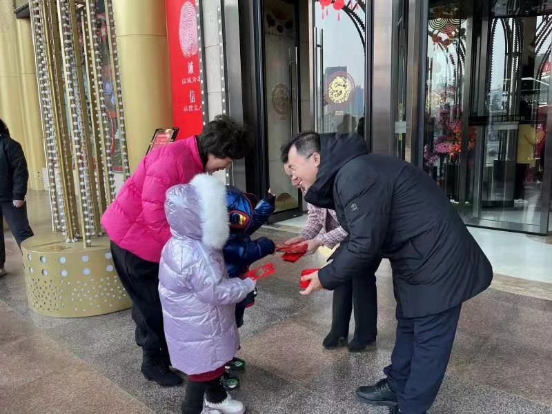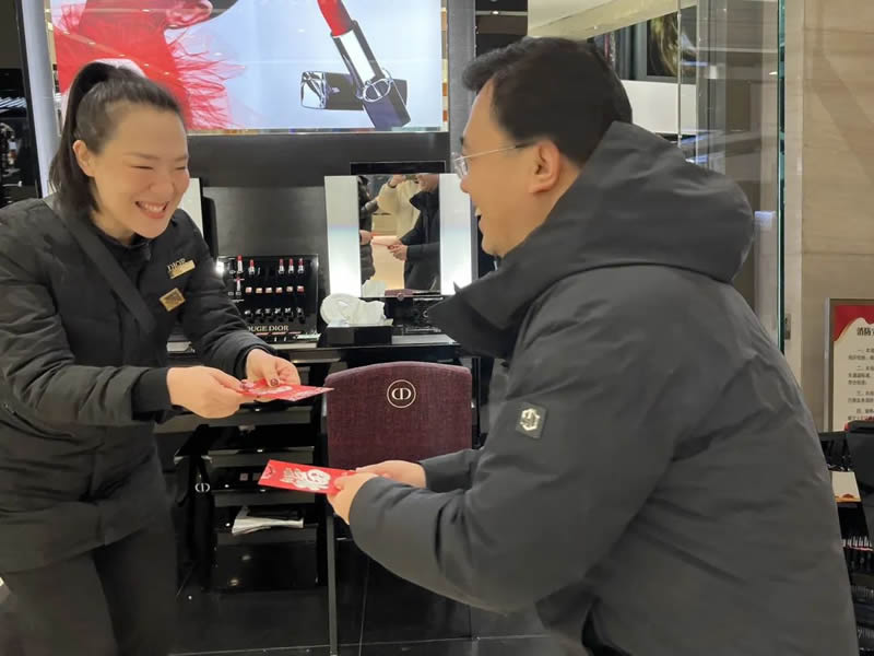 徐建航與現場顧客一一互動,為顧客朋友送上新年的祝福、小朋友們拿到龍年紅包,高興的歡呼雀躍!徐建航、劉雋、沈崢親切慰問當天值班在崗的員工朋友,給員工們送上新年祝福紅包!