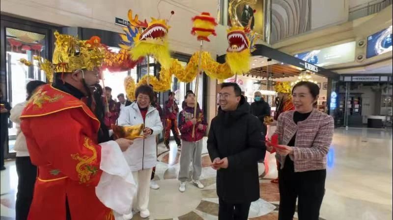 伴隨著歡快的舞龍樂曲,北國商城甲辰龍年迎賓儀式歡樂開啟!徐建航、劉雋在北國商城負責人沈崢陪同下,共同迎接著龍年新春來到北國商城的第一波客人!
