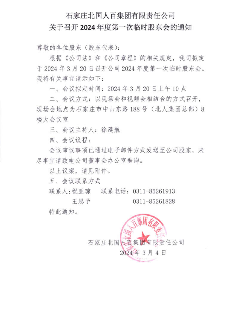 石家莊北國(guó)人百集團(tuán)有限責(zé)任公司關(guān)于召開 2024 年度第一次臨時(shí)股東會(huì)的通知