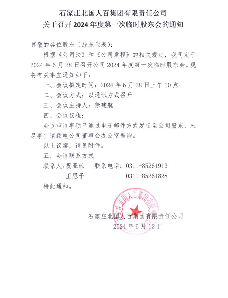 石家莊北國人百集團(tuán)有限責(zé)任公司關(guān)于召開2024年度第一次臨時(shí)股東會的通知