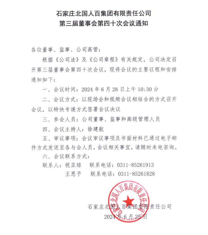 石家莊北國人百集團有限責任公司第三屆董事會第四十次會議通知
