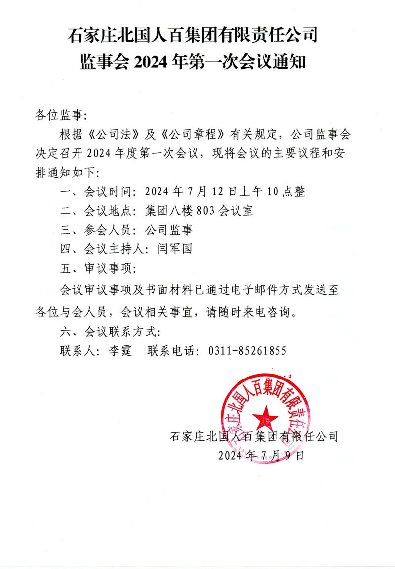 石家莊北國人百集團有限責(zé)任公司監(jiān)事會2024 年第一次會議通知
