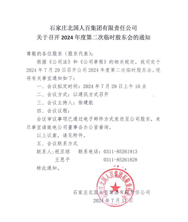 石家莊北國人百集團(tuán)有限責(zé)任公司關(guān)于召開2024年度第二次臨時(shí)股東會的通知