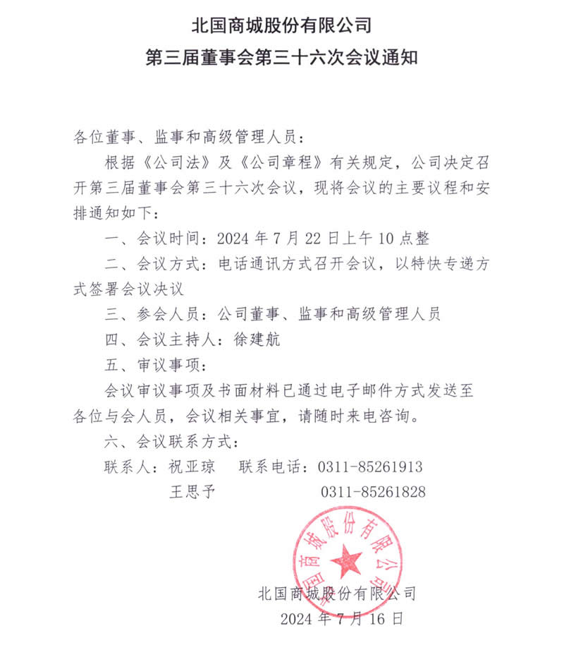 北國商城股份有限公司第三屆董事會第三十六次會議通知
