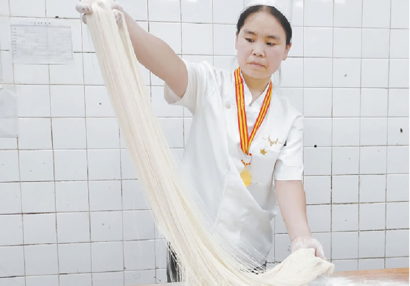劉凱紅自入職以來,始終堅(jiān)守在白案崗位一線,對(duì)工作充滿熱情與執(zhí)著。她不斷鉆研白案制作工藝,勇于創(chuàng)新,將傳統(tǒng)技法與現(xiàn)代飲食理念相融合,開發(fā)出一系列深受消費(fèi)者喜愛的面點(diǎn)產(chǎn)品。她練就了一手絕活——制作龍須面,抻面時(shí)如行云流水一般,抻出的面細(xì)如發(fā)絲,猶如一縷縷的龍須,故名龍須面。她制作的“金魚龍須面、紫薯芝士餅”在參加石家莊市飯店餐飲行業(yè)職工中式面點(diǎn)職業(yè)技能競(jìng)賽活動(dòng)中獲得第一名好成績(jī),榮獲“中式面點(diǎn)工種技術(shù)狀元”稱號(hào)。