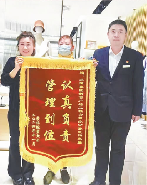 11月3日,顧客楊女士為新百廣場精品女裝商場主管李強送上一面錦旗,對他的管理和服務表示感謝。