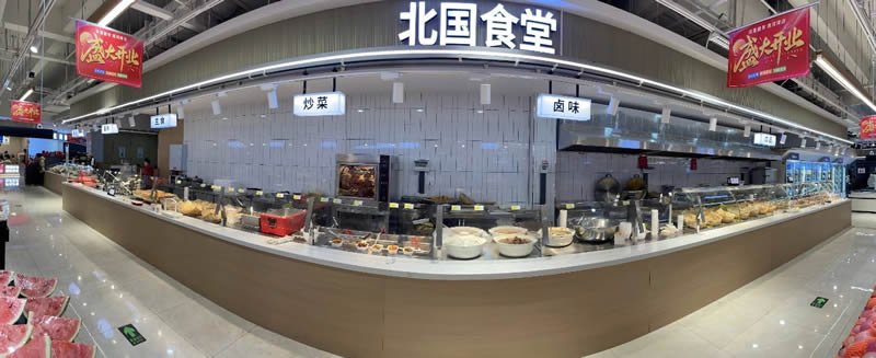 北國超市清河灣店整體裝修整潔明亮,店內(nèi)擴(kuò)大了鮮食區(qū)域,創(chuàng)新打造自營模式,開設(shè)北國食堂,提升現(xiàn)制、熟食等鮮食比例,增加現(xiàn)烤現(xiàn)炸、現(xiàn)炒現(xiàn)熬、明廚亮灶等場景,同時增設(shè)堂食區(qū)、顧客休息區(qū)及自助服務(wù)區(qū),充分滿足社區(qū)定位需求,為消費者提供更加安全、方便、舒適的購物環(huán)境。