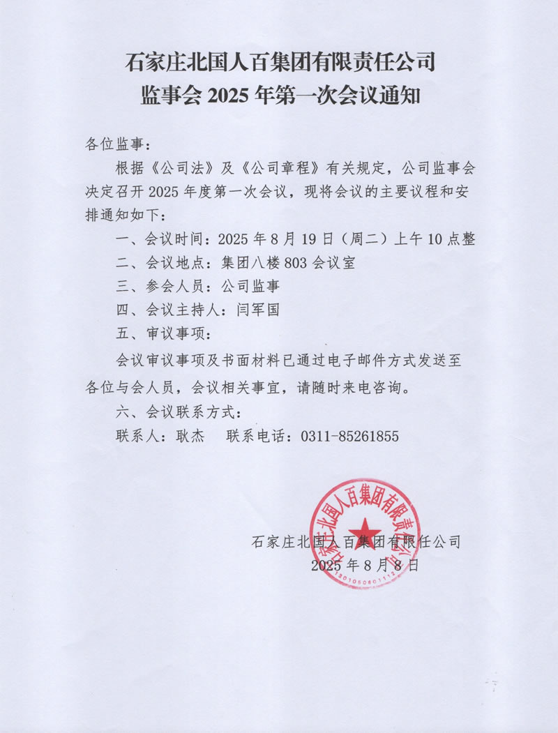 石家莊北國人百集團(tuán)有限責(zé)任公司監(jiān)事會2025年第一次會議通知
